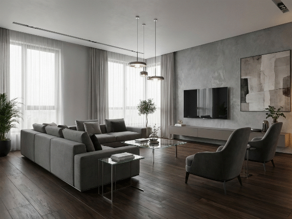 空間を引き締め、ガラスや金属、モノトーンの家具と組み合わせることで、スタイリッシュで洗練された雰囲気になります。